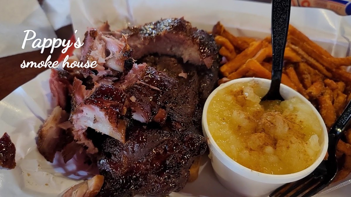 Pappy's for the first time and was not disappointed in the ribs actually they were phenomenal. They use fruit wood like apple or cherry to smoke so the smoke flavor is not overwhelming like some places that use hickory or mesquite. A half rack is 6 ribs, which had a LOT of meat on them. These are pork back ribs. The meat was tender amazing! you have 4 sauces to chose from,but I only tried the sweet, which was excellent. Not too sweet, good flavor with the ribs. The burnt ends so freaking tender mouth watering! The baked beans were good but the fried corn is must get! Service was great and pricing was super awesome! 100% recommend!