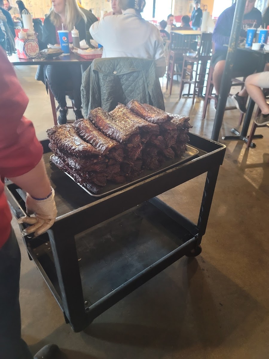 Where have these ribs been my whole life? You know you’re in luck when you walk in and they’re carting a huge stack of ribs in from the smoker. I love BBQ, but I rarely order ribs because they never blow me away. But after taking a recommendation from a local who was waiting ahead of us, I ordered the half-rack with baked beans and the fried corn on the cob. We also got the mouth-watering brisket. UNBELIEVABLE! The meat is so tender, but stays on the bone until you want it to fall off. The flavor packs a punch, so much so, I didn’t need any sauce—though I tried a couple flavors. I’m so glad I tried the fried corn on the cob, because it was a good compliment to the richness of the ribs. Service was organized and FAST! I cannot recommend this place enough!